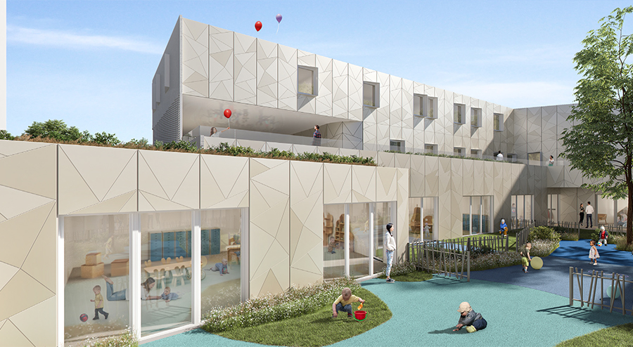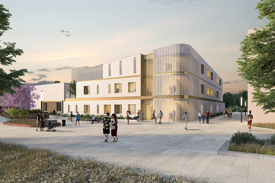 Une double crèche (donc 2 structures d’accueil) avec un total de 97 berceaux et un centre de Protection Maternelle et Infantile (PMI). Le pôle accueillera la crèche en janvier 2026.