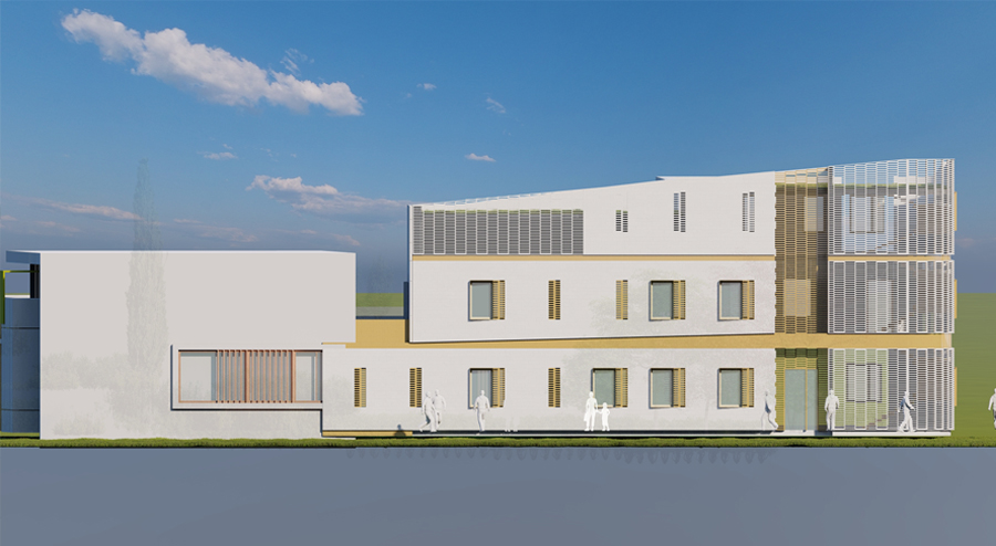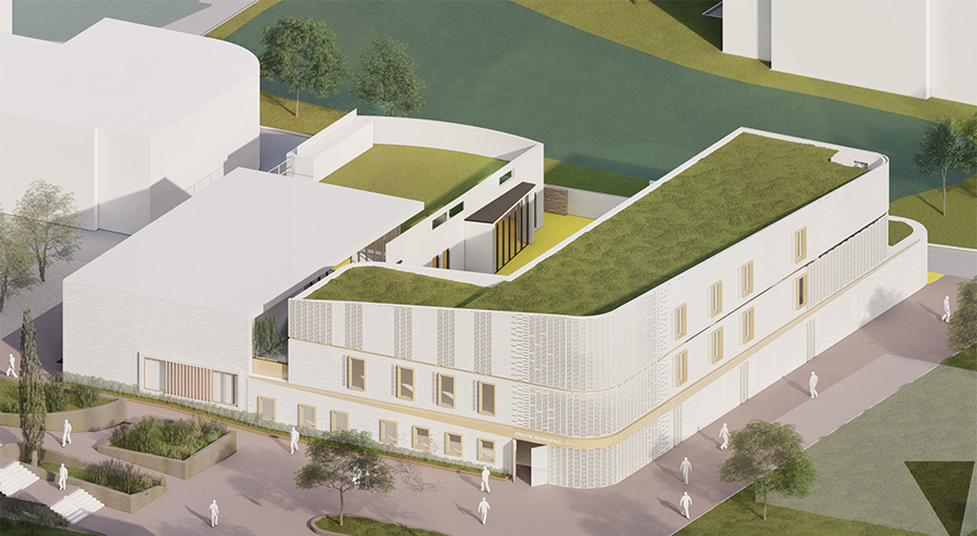 Le pôle a été pensé comme une structure neuve, entièrement dédiée à l’enfant, intégrant une démarche vertueuse et respectueuse de l’environnement. Il s’inscrit dans une logique de construction biosourcée à très faible impact environnemental, avec l’utilisation de briques produites en ciment « zéro carbone » evoZero®, reposant sur une ossature en bois (FOB). L’utilisation de briques à base de ciment « zéro carbone » sur une opération de cette envergure permet une économie en équivalent CO₂ d’environ 13 tonnes.